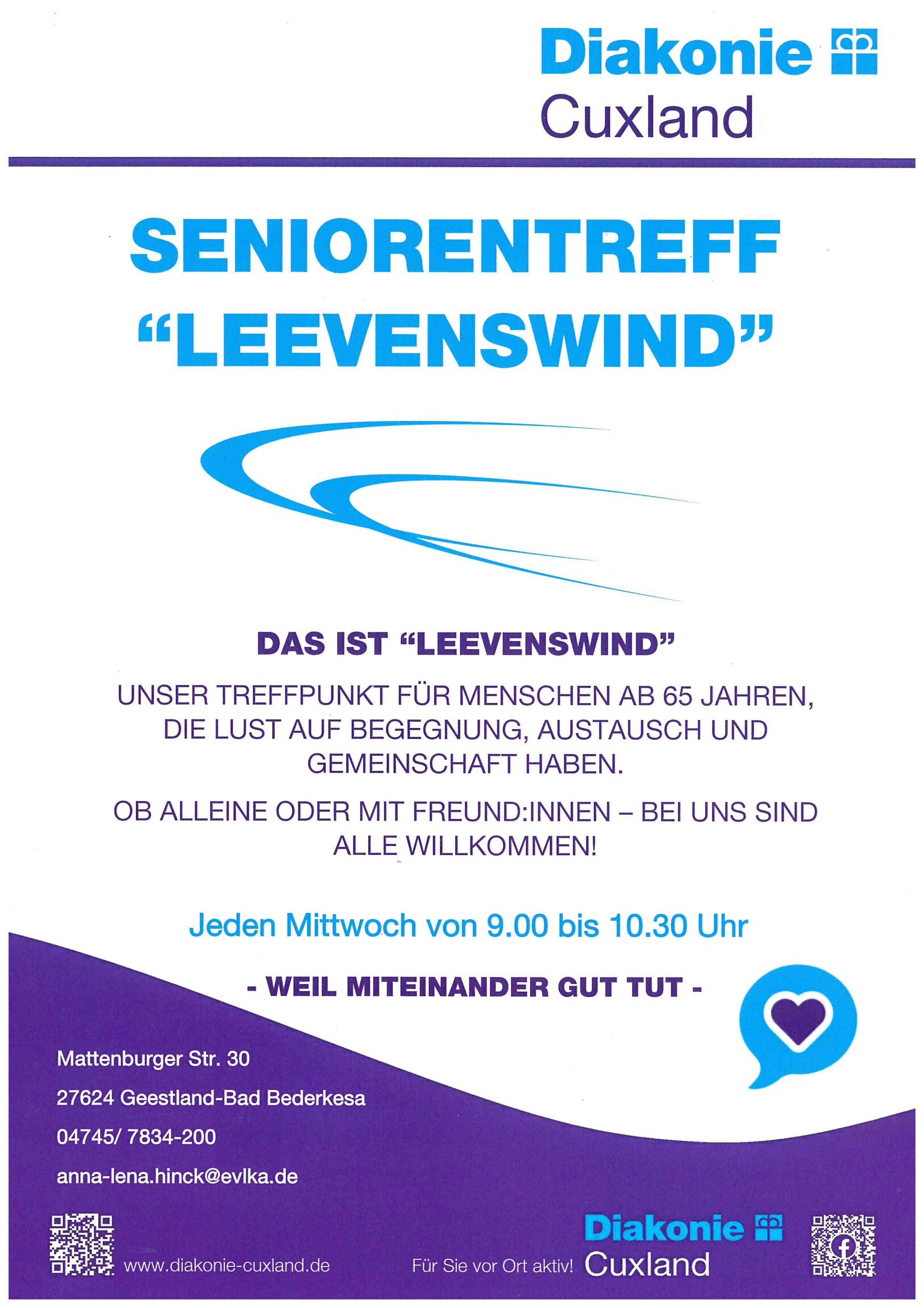 Wer sich für den „Schwangeren-Treff“ der Diakonie in Cuxhaven, Segelckestraße 45 bis 47, oder die Gruppe „Unerfüllter Kinderwunsch“ in Bad Bederkesa, Mattenburger Straße 30, anmelden will, der kann dies per Mail oder telefonisch tun. Carmen Ewen ist erreichbar unter carmen.ewen(at)evlka.de oder unter 04721 5604-13. Natalie Johannsson hat die Mail-Adresse natalie.johansson(at)evlka.de, telefonisch ist sie erreichbar unter 04745 7834-250.
