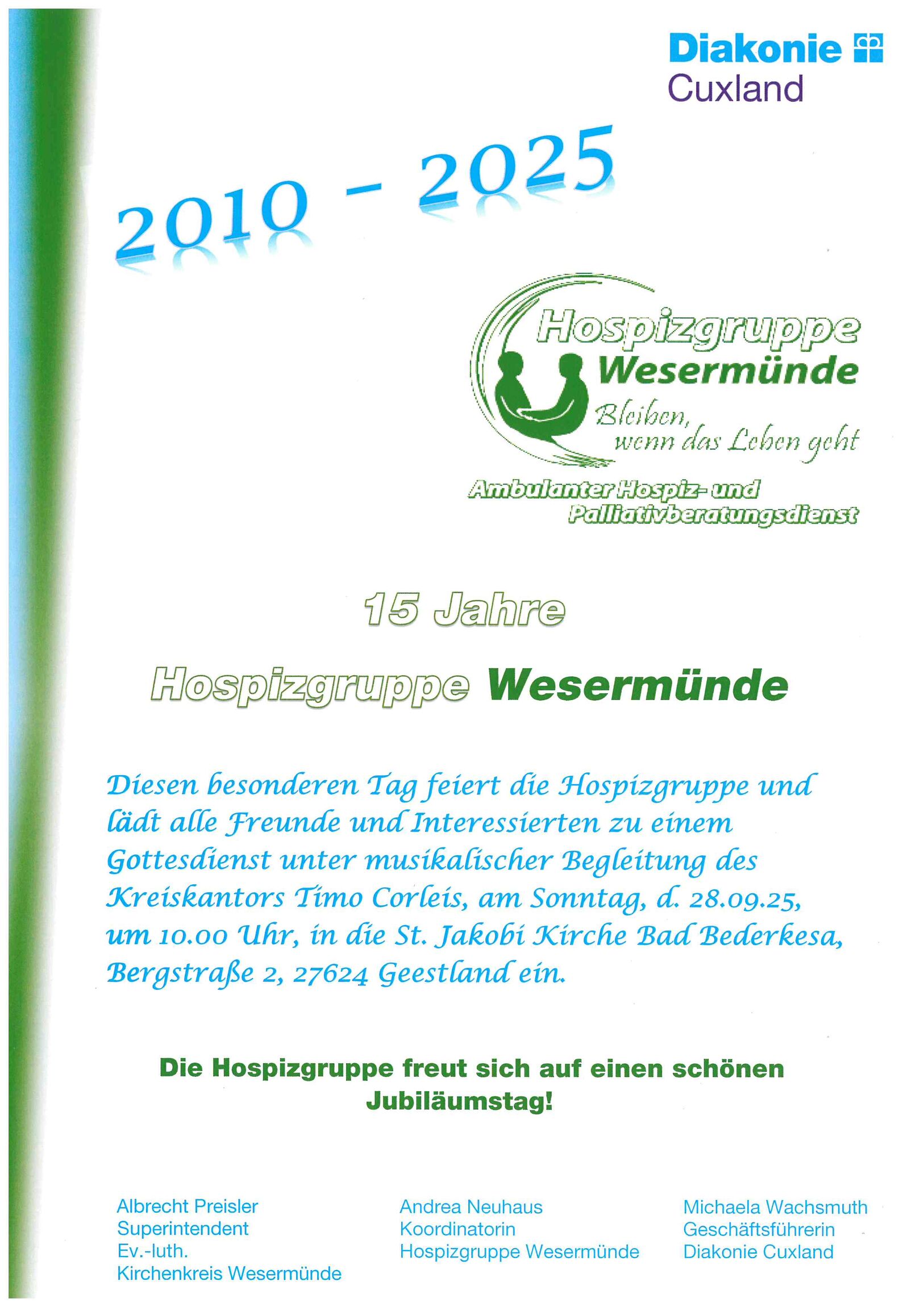 Diesen besonderen Tag feiert die Hospizgruppe Wesermünde und lädt alle Freunde und Interessierten zu einem Gottesdienst am 28.09.2025, um 10.00 Uhr, in der St. Jakobi Kirche Bad Bederkesa, Bergstraße 2, 27624 Geestland ein.